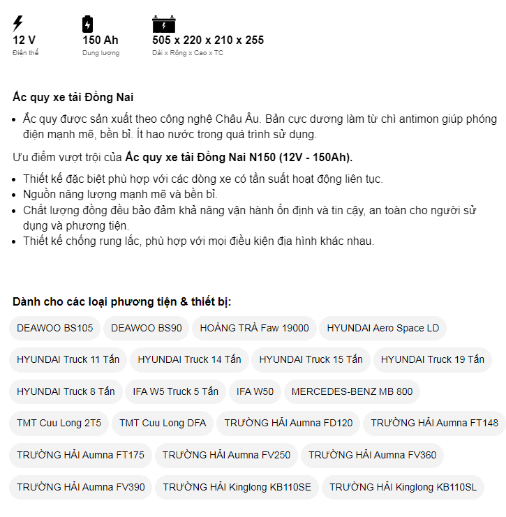 • Dung lượng: 150Ah